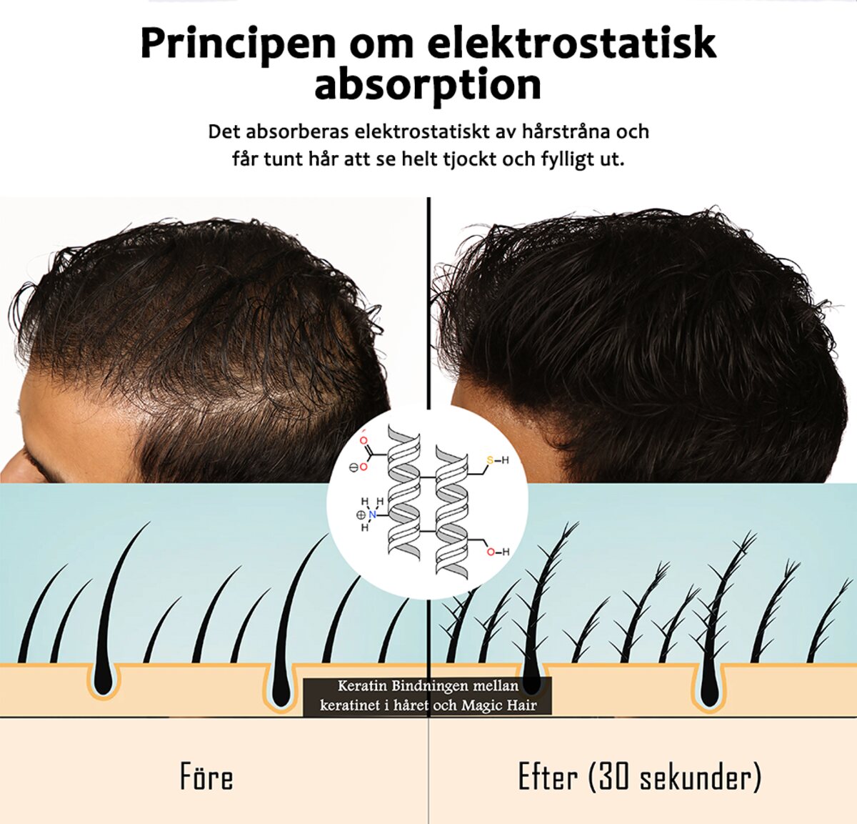 Magic Hair, där vetenskap möter hårvård i en banbrytande kombination. Vår avancerade teknologi bygger på en nano-keratin baserad lösning som använder elektrostatisk absorption för att förena sig med ditt befintliga hår. Resultatet är en naturlig och fylligare look som är enkel att uppnå. Med Magic Hair får du det bästa från vetenskap och skönhet i ett enda produkt.